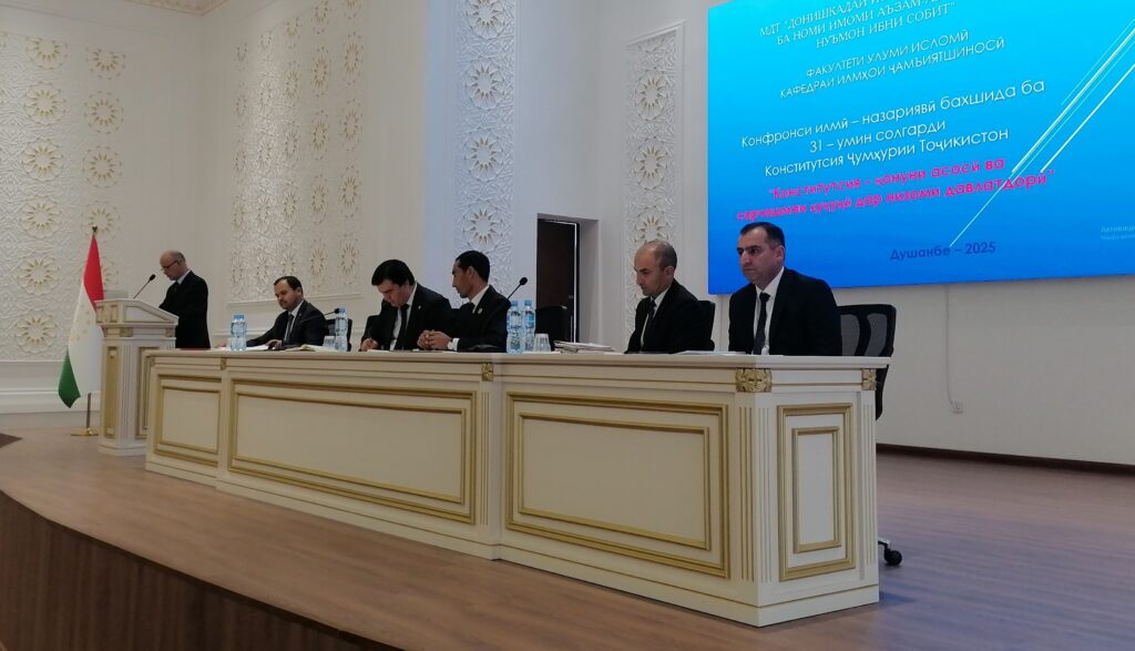 Имрӯз дар Донишкадаи исломии Тоҷикистон ба номи Имоми Аъзам Абуҳанифа Нуъмон ибни Собит Конфронси илмӣ – назариявӣ бахшида ба 31 – умин солгарди Конститутсияи Ҷумҳурии Тоҷикистон зери унвони “Конститутсия – қонуни асосӣ ва сарчашмаи ҳуқуқӣ дар низоми давлатдорӣ” бо иштироки ректори навтаъингаштаи Донишкада Аҳтамзода Абдуалим Аҳтам баргузор гардид. Конфронси донишкадавӣ бо ибтикори Кафедраи илмҳои ҷамъиятшиносӣ ташкил гардида, дар он чор нафар устодони кафедраи ва як устоди Донишгоҳи миллии Тоҷикистон дар мавзӯъҳои гуногуни тавсифи Сарқонун дар низоми давлатдорӣ баромад карданд.